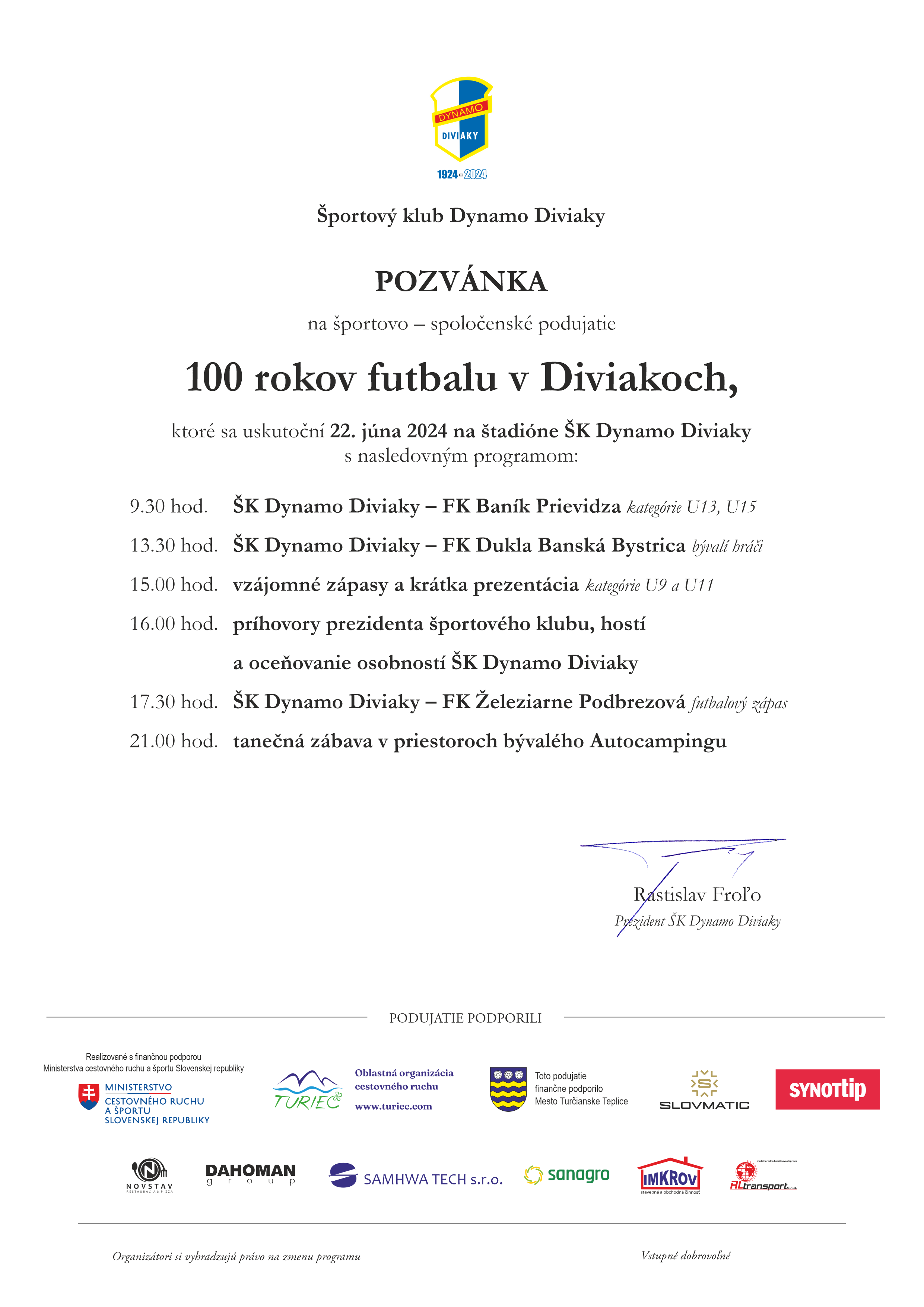 Boli by sme veľmi radi, keby si cestu na štadión Dynama v sobotu 22. júna 2024 našlo čo najviac bývalých hráčov, trénerov, fanúšikov a podporovateľov klubu, ale a aj rodičov a starých rodičov detí a mládeže. Dynamo, aj keď má 100 rokov je klubom mladých. Všetci ste srdečne pozvaní a vítaní.
